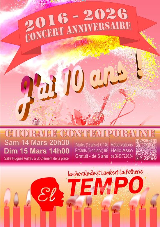 Venez assister au nouveau spectacle de la chorale El Tempo de Saint Lambert la Potherie qui fête ses 10 ans cette année ! Passez un moment inoubliable en écoutant la rétrospective de 10 ans de musique actuelle, polyphonique, dynamique, drôle et émouvante ! Rendez-vous samedi 14 mars à 20h30 et dimanche 15 mars à 14h […]
